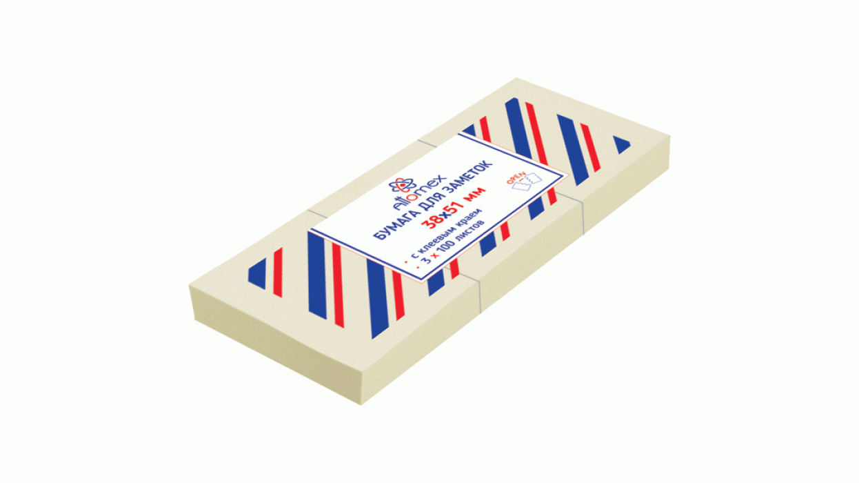 Бумажный блок с клеевым краем, формата 38×51 мм, плотностью 75 г/ м². Клейкие листочки крепятся на поверхность различной фактуры — дерево, пластик, кожу, ткань. После удаления бумаги на поверхности не остается следов клеевого состава, лист можно крепить повторно. В блоке-кубике 3 упаковки стикеров желтого цвета. Отгружается упаковкой. Товар относится к серии "эконом"
