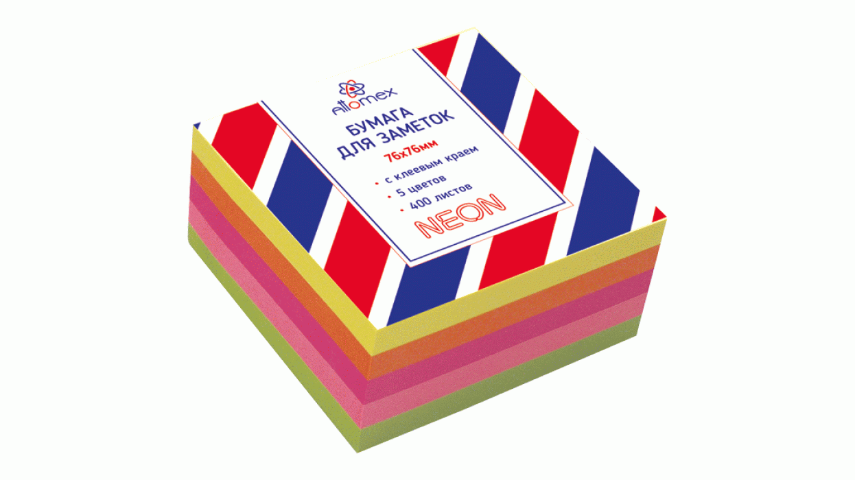 Бумажные стикеры Attomexс клейким краем. Размер — 76×76 мм, скомбинированы 5 неоновых цветов. Плотность бумаги составляет 75 г/кв.м, клейкий слой — 27 Н/м. В упаковке 400 листов. Стикеры отлично держатся на любых поверхностях и предметах. После удаления бумаги на поверхности не остается следов клеевого состава, лист можно крепить повторно. Товар относится к серии "эконом"
