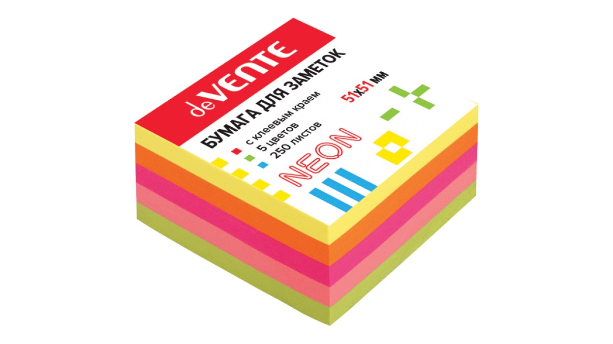 Клейкая бумага для заметок "deVENTE" 51x51 мм, 250 листов, офсет 75 г/м, 5 неоновых цветов, 2010335
