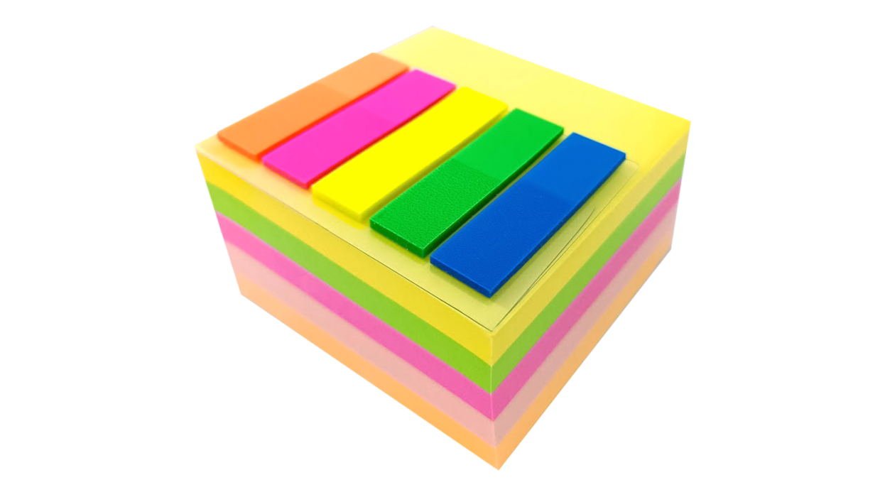 Набор клейкой бумаги для заметок и этикеток-закладок "deVENTE. Pastel" бумага: 76x76 мм, 400 листов, офсет 75 г/м², 4 пастельных цвета; этикетки: пластиковые полупрозрачные в форме стрелки 45x12 мм, 5x25 листов, 5 пастельных цветов, в термоусадочной пленке