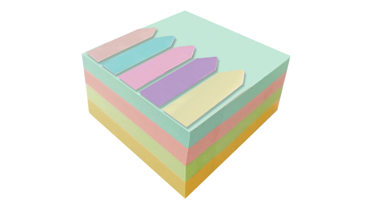 Набор клейкой бумаги для заметок и этикеток-закладок "deVENTE. Pastel" бумага: 76x76 мм, 400 листов, офсет 75 г/м², 4 пастельных цвета; этикетки: пластиковые полупрозрачные в форме стрелки 45x12 мм, 5x25 листов, 5 пастельных цветов, в термоусадочной пленке