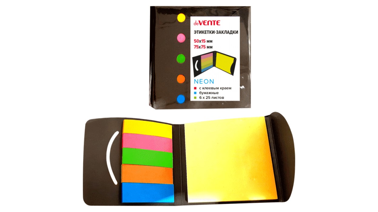 Набор самокл. закладок бумажных 50x15 мм и стикеры"deVENTE" 75x75 мм, 6x25 листов, 5 неон. цветов, в крафт упак., 2011000