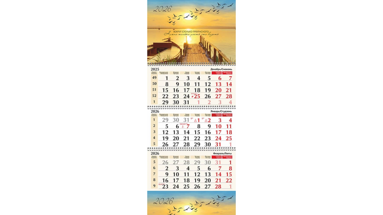 Календарь настенный на 2026 год, квартальный, С БЕЛОРУССКИМИ ПРАЗДНИКМИ. Квартальный календарь : календарные блоки с 01 декабря 2025 по 31 января 2026 года. Настенный календарь – неотъемлемый предмет любого современного офиса, который вполне гармонично впишется в любой домашний интерьер. При всей своей простоте и привычности этот товар станет отличным выбором для подарка, объединив в себе практичность, удобство и актуальность в течение долгого времени. Это наглядный и удобный источник информации, отличный рекламный инструмент и практичный фирменный сувенир.