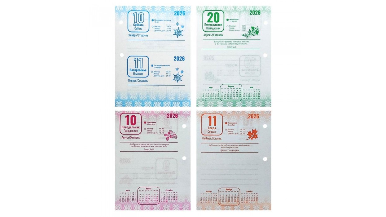 Настольный перекидной бизнес-календарь для Республики Беларусь на 2026 год имеет размер 10х14 см. Предназначен для размещения на подставке. Блок календаря состоит из 160 листов офсетной бумаги (320 страниц) с печатью в четыре краски. Перфорирован, расстояние между отверстиями составляет 4,5 см.