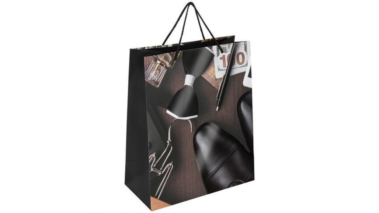 Изготовлен из ламинированного мелованного картона с веревочными ручками из полипропилена. Размер – 26x13x32 см. Пакет выполнен в мужском стиле в чёрном цвете. С лицевой стороны пакета некоторые детали покрыты выборочным лаком.