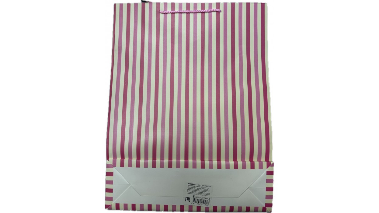 Изготовлен из ламинированного мелованного картона с веревочными ручками из полипропилена. Размер – 43x33x10 см. Пакет выполнен в розовых тонах тонах.