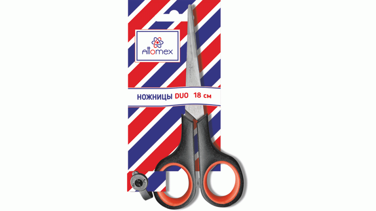 Канцелярские ножницы (офисные) эргономичного дизайна, изготовленные из стали. Пластиковые ручки имеют анатомическую форму для естественного положения инструмента в руке, оснащены резиновыми вставками, которые исключают скольжение. Длина ножниц — 17 см. Товар относится к серии "эконом"
