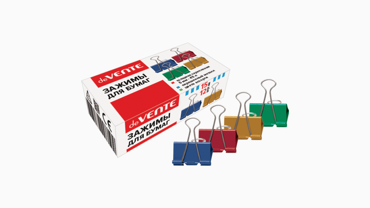 Зажим для бумаг "deVENTE" металлический (15 мм) толщина скрепления до 5 мм, цветной ассорти, 12 шт в кор, 4131000
