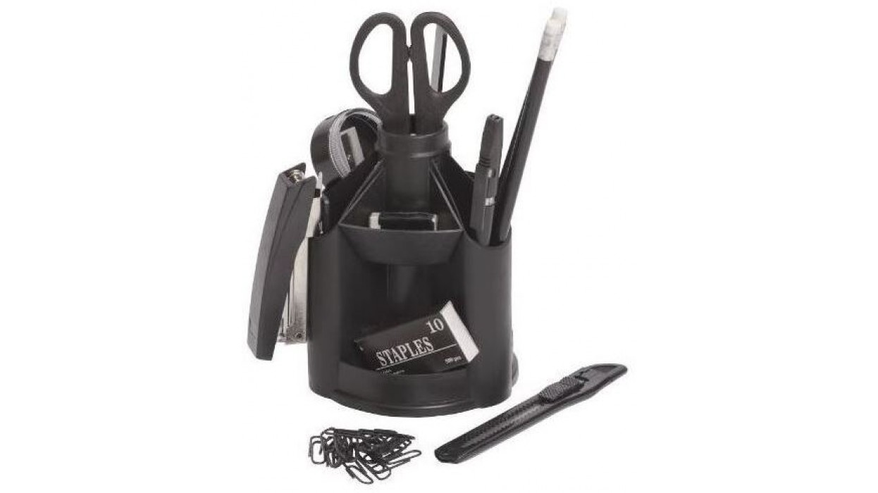 Настольный набор-органайзер, 13 предметов (шариковая ручка - 1 шт., карандаш с ластиком - 2 шт., ножницы, нож, линейка, точилка, степлер №10, скобы №10 - 500 шт., скрепки, кнопки-гвоздики, ластик, подставка), черный, вращающийся на 360 градусов.