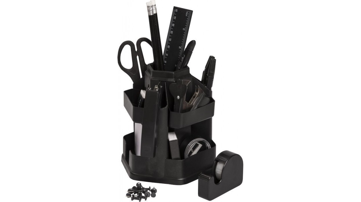Настольный набор-органайзер, 17 предметов (шариковая ручка - 2 шт., карандаш с ластиком - 2 шт., ножницы, нож, линейка, точилка, степлер №10, скобы №10 - 500 шт., скрепки, кнопки-гвоздики - 10 шт., клейкая лента в диспенсере, антистеплер, бумага для заметок, ластик, подставка), черный, вращающийся на 360 градусов.