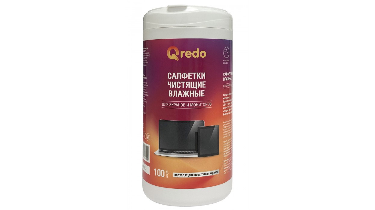 Салфетки чистящие влажные QREDO для экранов и мониторов всех типов, 100 штук в тубе, арт. 41-4405