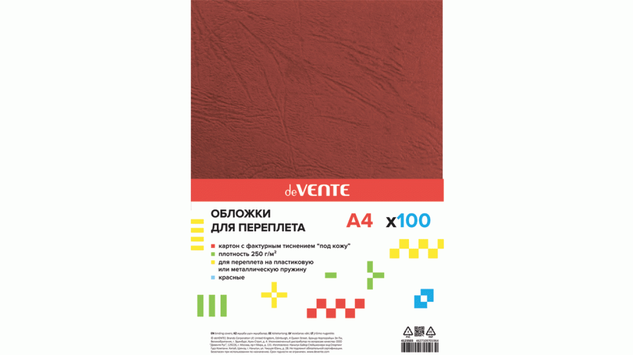 Обложка для переплета "deVENTE для оформления документов. Delta" A4, картон с тиснением "кожа" красного цвета, плотность 250 (230) г/м², 100 л