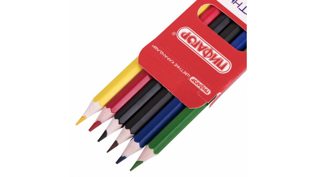 Набор состоит из 6 самых популярных цветов: красный, желтый, зеленый, синий, коричневый, черный. Шестигранная форма сечения корпуса позволяет карандашу не скатываться с поверхности стола во время занятий рисованием. Карандаши изготовлены из нетоксичного переработанного пластика. Корпус при разломе не образует острые края и безопасен для детей. Грифель легко затачивается и обладает повышенной прочностью. Все карандаши заточены и поставляются в картонной упаковке с европодвесом.