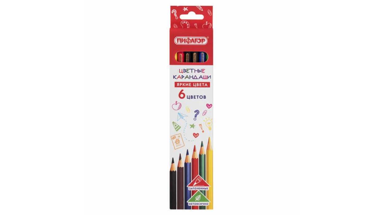 Карандаши цветные ПИФАГОР, 6 цветов, пластиковый шестигранный корпус, 182047