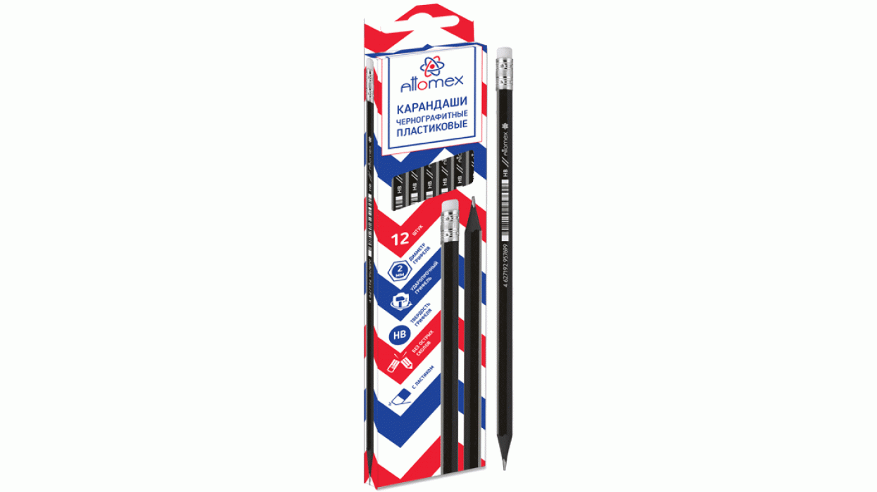Карандаш ч/г "Attomex" HB, диаметр грифеля 2 мм, шестигранный с ластиком, заточенный, пластиковый, черный, 5032110