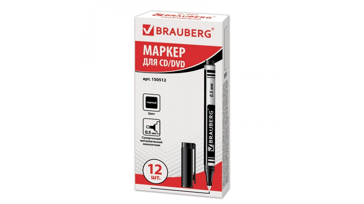 Маркер для CD и DVD BRAUBERG, ЧЕРНЫЙ, супертонкий металлический наконечник, 0,5 мм, 150512