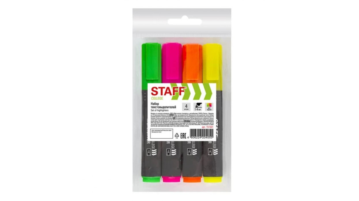 НАБОР 4шт., текстмаркеры STAFF, скошен. наконечник 1-4 мм, (лимон, зел, оранж, роз), 151501