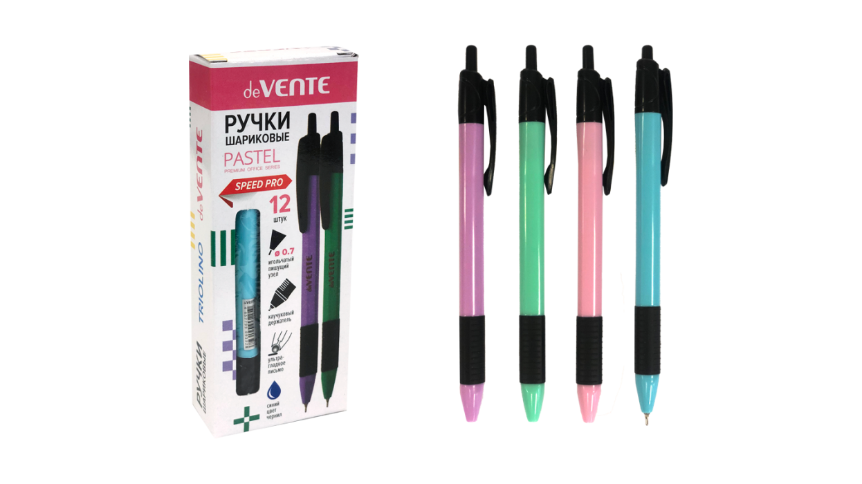 Автоматическая шариковая ручка. Корпус цветной пластик (ассорти, пастельные цвета) с резиновым держателем и пластиковым клипом. Диаметр пишущего наконечника - 0,7 мм. Цвет чернил - синий.