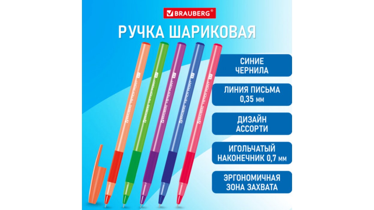 Ручка шариковая BRAUBERG "i-STICK POINT", синяя, корпус ассорти неон, линия письма 0,35 мм, 144022