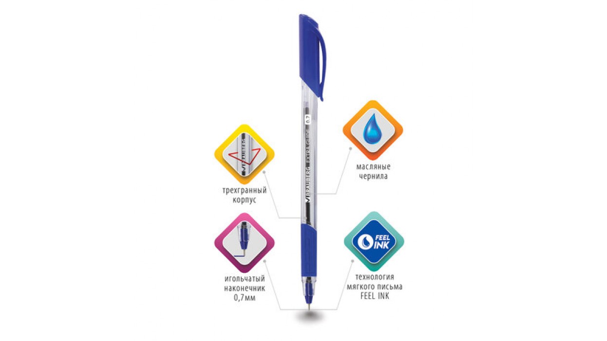 Шариковая ручка с прозрачным трехгранным корпусом и удобным резиновым держателем, препятствующим скольжению пальцев при письме. Специальные масляные чернила ультрапониженной вязкости синего цвета и надежный пишущий узел обеспечивают непревзойденно мягкое и комфортное письмо. Диаметр пишущего узла 0,7 мм создает тонкую линию письма, равную 0,35 мм.
