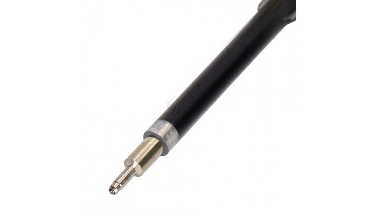Длина стержня составляет 107 мм. Диаметр пишущего узла 0,7 мм создает ровную линию письма, равную 0,35 мм. Имеет игольчатый наконечник. Цвет чернил - чёрный. Поставляется в пакете с подвесом.
