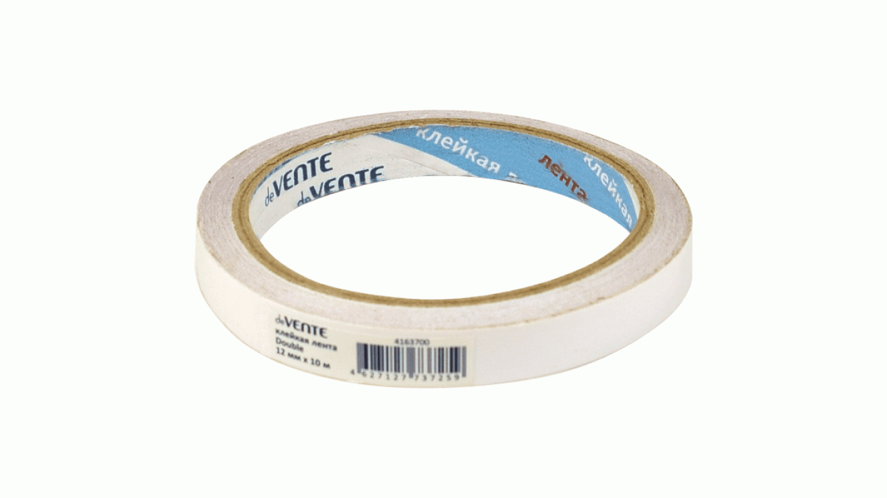 Двусторонняя лента общего назначения позволяет быстро и легко выполнить соединие предметов из металла, пластика, стекла, керамики, дерева и т.д. Предназначена для работы с неровными и шероховатыми поверхностями, не оставляет следов. Клейкая лента двусторонняя "deVENTE" полипропиленовая основа 90 мкм, 12 ммx10 м, картонная втулка, индивидуальная маркировка